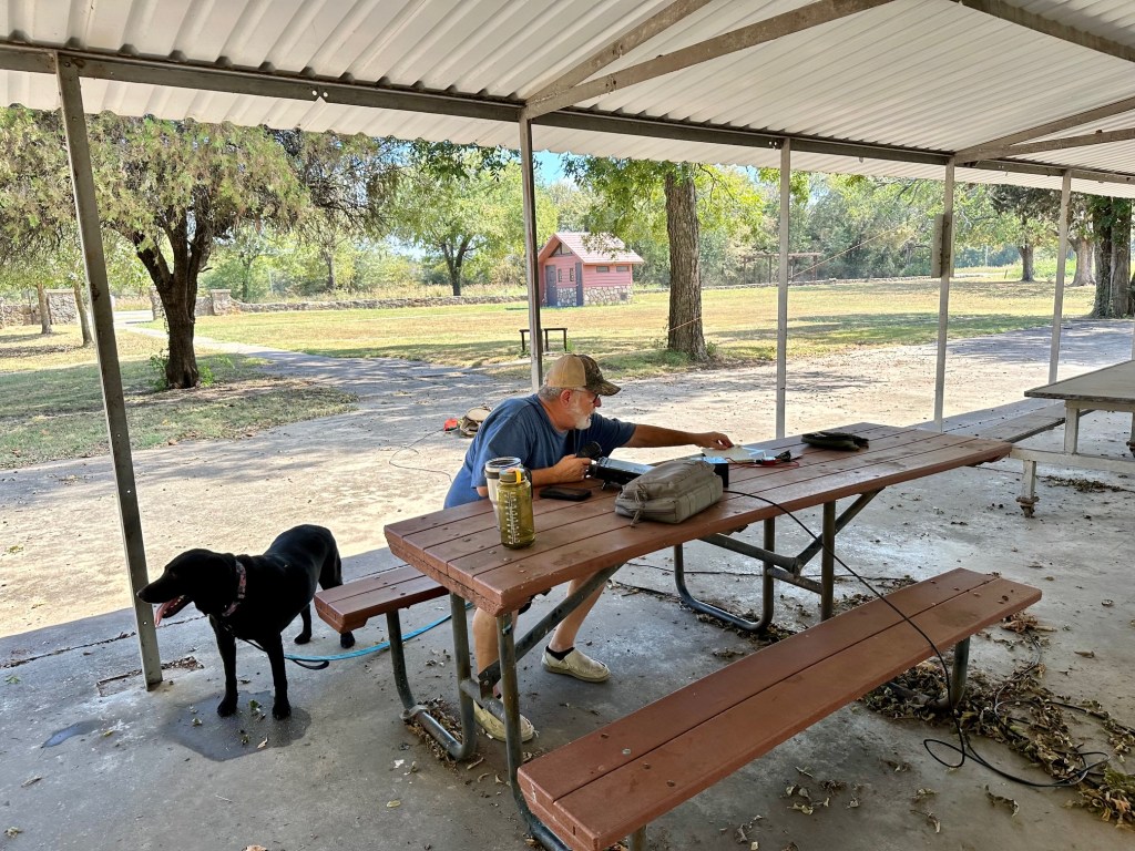 Again, working in series, I made a quick activation with CW then set the rig to SSB for Dave’s activation. By this time of morning, it was becoming obvious there were contests going on – the SSB portion of 20 meters was busy and crowded. There was at least one “Not Texas” QSO Party going on, maybe more. Dave hunted using the Spots page but was challenged to find “clean air” to call CQ POTA. Cool and calm as always, her got ‘er done.