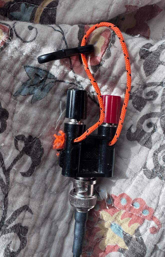 So, I made a 30’ length of RG-316 feed line. I used my fishing pole holder thingy and raised my 20’ POTA20 in the back yard. I used a female BNC to Binding Posts adapter and cut some wire.