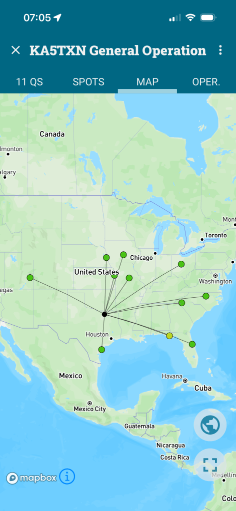 Back to the dipole – I powered up my CFT1 on the porch and the first thing I noticed was how quiet it was. The normal sub-woofer of QRM in my yard was abnormally quiet and pleasant. I brought up Ham2K POLO on my phone and scrolled down the list of spots on 20 meters.